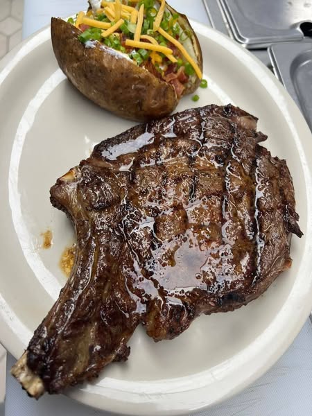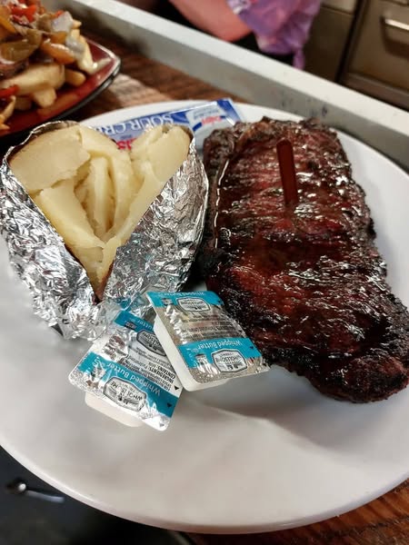 搜索关键词 restaurant specials, steak sampler, smoked pork chop, prime rib, peach salad, BBQ优势 New steak sampler platter,Robust smoked pork chop,Prime rib available,Fresh, locally grown peach salad,10% cash discount