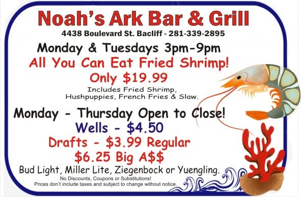 搜索关键词 Galveston Bay restaurant, Winter specials happy hour, waterfront dining, kids eat free, all you can eat seafood, palapa bar, gift card promotion, bayside breakfast, bacliff restaurant, noah's ark food优势 Waterfront Location,Winter Season Specials,Happy Hour Deals,Value Meal Deals,Kids Eat Free,Gift Card Promotion,All You Can Eat Options,Upstairs Covered Palapa Bar,Breakfast on The Bay,Island Vibes