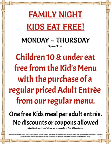 Kids Eat Free on Monday - Thursday 3pm - 9pm
