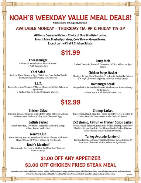 Value Meal Deals Available Monday-Thursday 11am - 9pm & Fridays 11am -3pm. 6 meals for under $12.00 - 7 Meals under $13.00