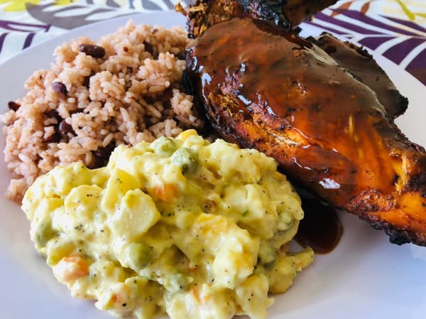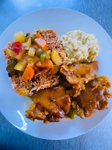 🔹STEWED PIG FEET SERVED WITH COCONUT RICE & BEANS AND CHOICE OF POTATO SALAD OR COLESLAW:$15.00