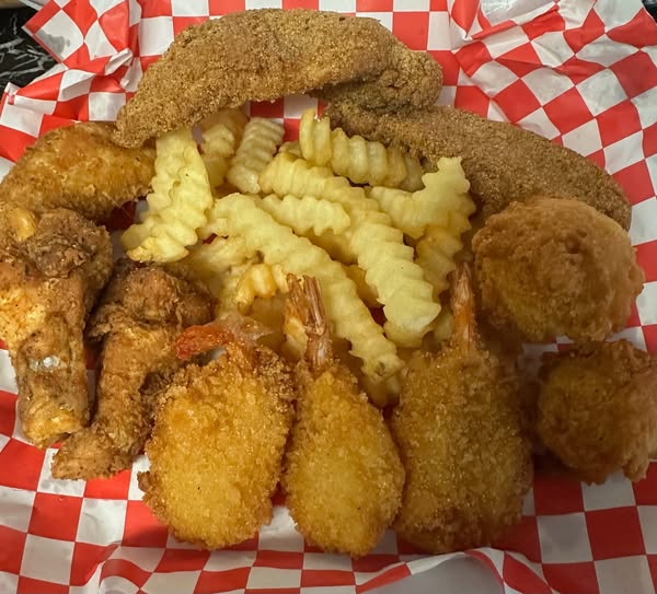 Basket of Fried Fish, Wing Ding, Fried Shrimp, Crinkled Fries and Hush Puppies $20.00