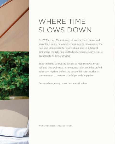 This month, take the time to slow down and savor life’s quieter pleasures. From tranquil mornings by the pool and afternoons of spa bliss, to exquisite dining and curated experiences, JW Marriott Muscat is your haven to pause, refresh, and be present.