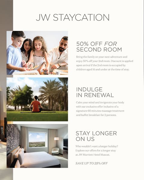 搜索关键词 JW Marriott Muscat, luxury hotel, Oman travel, Muscat spa, relaxing vacation, curated experiences, indulge yourself, tranquil mornings, hotel promotion, exclusive getaway优势 Tranquil environment,Exquisite dining,Curated experiences,Spa services