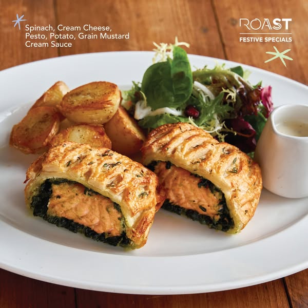 搜索关键词 Roast BKK, festive specials, Salmon Wellington, Sticky Toffee Pudding, Bangkok restaurant, holiday menu, limited time offer, fine dining, pecan dessert, salmon dish优势 Festive themed dishes,High-quality ingredients (salmon, pecans),Visually appealing food presentation,Limited-time availability