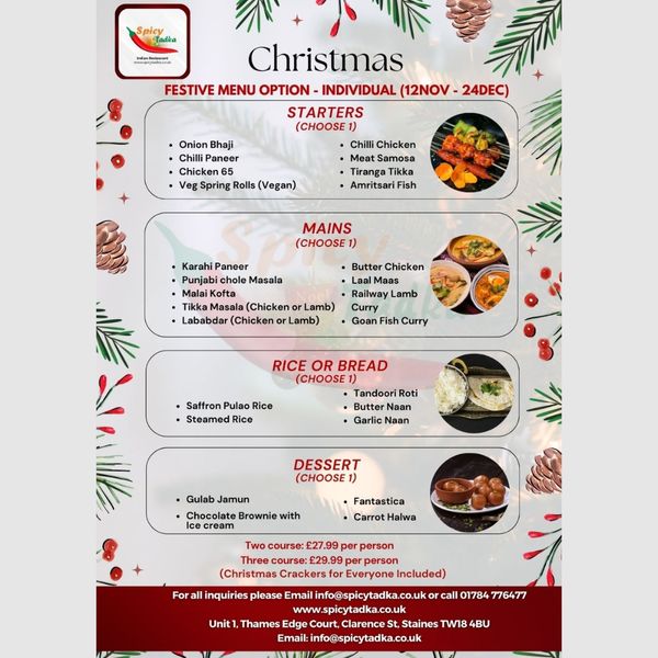 搜索关键词 Spicy Tadka Christmas, Festive Indian Flavors, Christmas Restaurant Staines, Indian Food Egham, Christmas Feast, Spicy Holiday Menu, Tadka Christmas Feast, Indian Community Restaurant, Christmas Dinner Special, Staines Restaurant Indian优势 Wide variety of food options,Celebrates diversity,Special festive menu