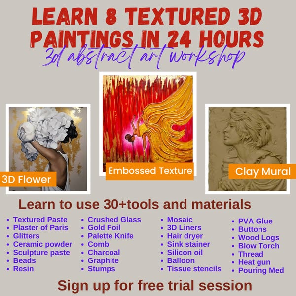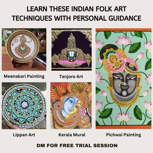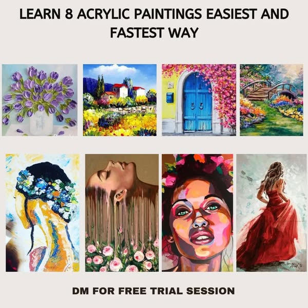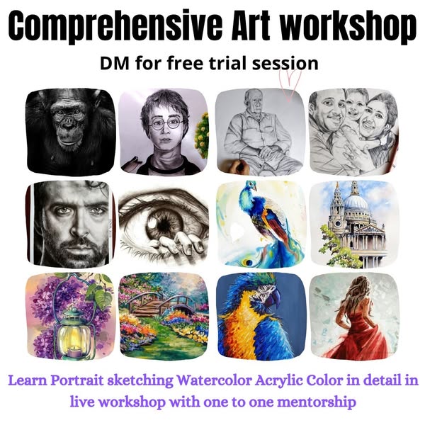 Learn multiple artforms in the most honest ,live , interactive workshop. Learn the following : 12 Paintings Abstract Art course 8 Paintings 3D mix media course 8 Paintings acrylic Art course 8 Paintings Watercolor course 5 Painting Indian folk art course 5 Portraits Charcoal Sketching course. 6 Paintings Dry Pastel course 5 Articles resin course 6 Paintings Color pencils 5 Paintings portrait in ink 5 Flower Russian Sculpture 4 painting fabric art Message us for attending a free trial live session where you will learn some amazing stuff absolutely free of cost.