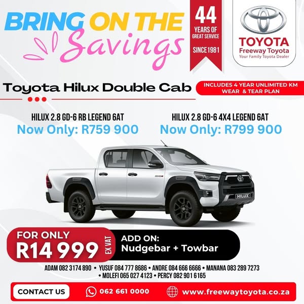 搜索关键词 Toyota Hilux, Freeway Toyota, bakkie deals, truck for sale, affordable Toyota, double cab Hilux, reliable pickup, South Africa Toyota, Toyota finance, best bakkie优势 Affordable finance plans,Exclusive savings,Toyota's reliability and toughness,Variety of cab options