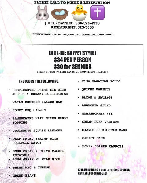 搜索关键词 Easter Brunch, Bottomless Mimosas, Bloody Marys, Specialty Cocktails, Restaurant Specials, Easter Sunday, Brunch Menu, Holiday Brunch, Limoncello Mule, Maple Bourbon Coffee优势 Specialty cocktails,Bottomless Mimosas and Bloody Mary's,Festive Easter theme
