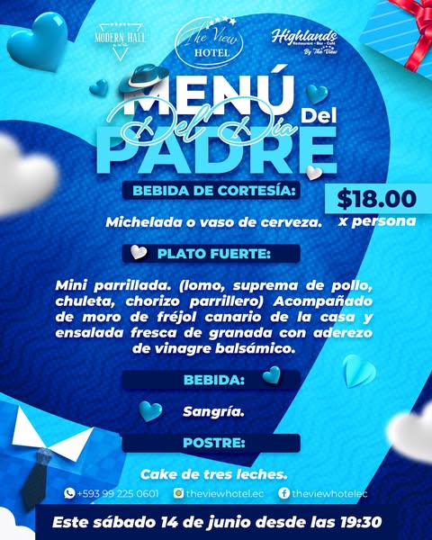 Este Día del Padre es la ocasión perfecta para agradecerle todo con una cena inolvidable en highlands, el restaurante de the view hotel. Brinda con él, comparte su plato favorito y haz que se sienta tan especial como lo merece. 💙🍽️