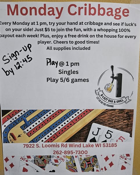 Cribbage every Monday, sign up by 12:45, Play at 1 o'clock