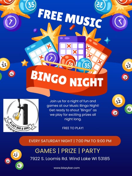 Music Bingo every Saturday night from 7 to 9 pm. FREE