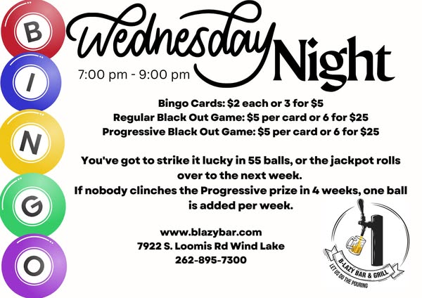 Wednesday night regular & progressive BINGO, 7 to 9 pm.