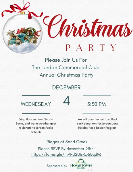 •Jordan Commercial Club at Ridges At Sand Creek - Christmas Party - Wednesday, Dec 4, 5:30 pm