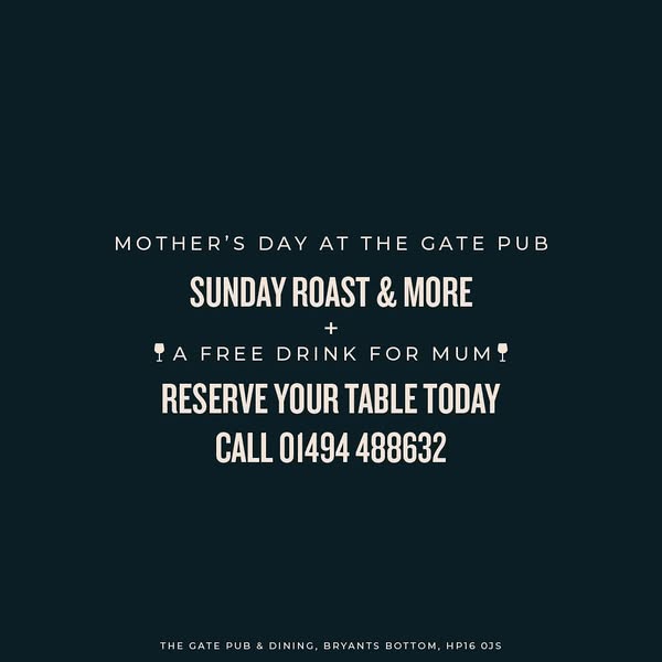 搜索关键词 Mother's Day Sunday roast, The Gate pub, family meal, free drink, English countryside, gastropub, British food, family lunch, special offer, book now优势 Celebrates Mother's Day,Family time,Free drink for Mum,Traditional English food