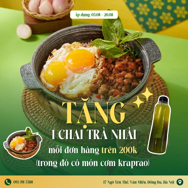 ✅ Tặng 1 CHAI TRÀ NHÀI với đơn hàng từ 200K (trong đó có món cơm kraprao)