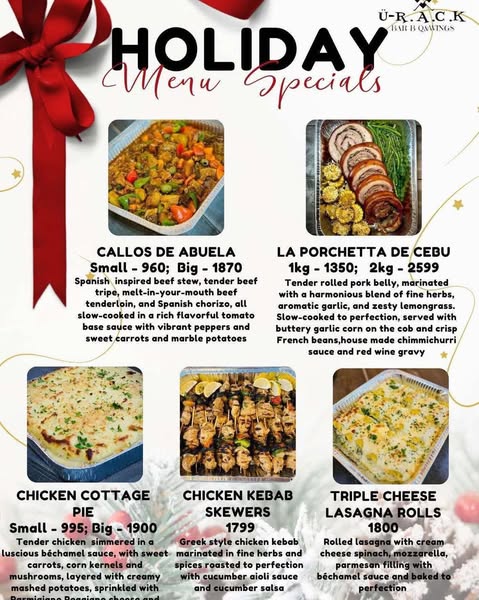 搜索关键词 Holiday menu, Christmas menu, New Year menu, Restaurant San Fernando, Good food San Fernando, Family feasting, Exclusive Holiday, Urack Restaurant, Limited offer, Happy memories food优势 Exclusive holiday menu,Creates happy memories,Limited time offer