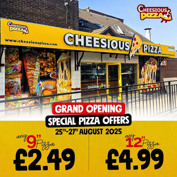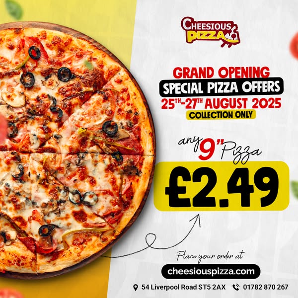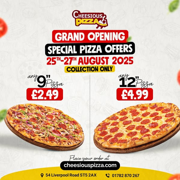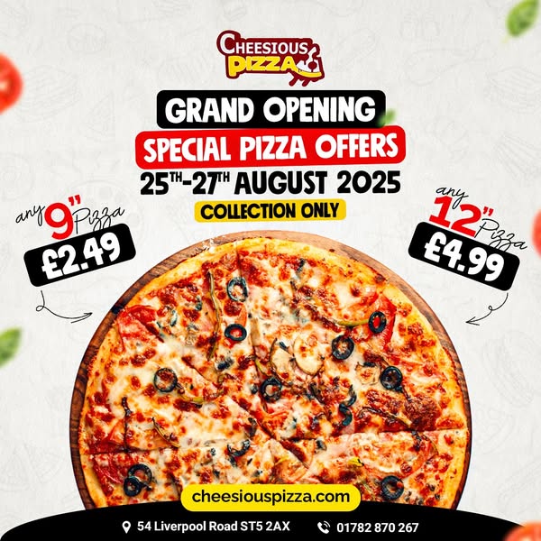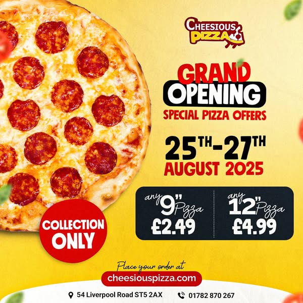 Celebrate our Grand Opening at Cheesious Pizza, 54 Liverpool Road, Newcastle-under-Lyme from 25th to 27th August! Grab delicious pizzas packed with flavour for just £2.49 each. Perfect for families, students & pizza fans in Newcastle-under-Lyme and Stoke-on-Trent.
