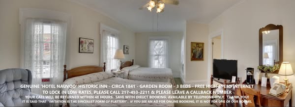 Direct booking, BY TELEPHONE-ONLY, saves you money! It is said that “Imitation is the sincerest form of flattery”. IF YOU SEE AN AD FOR ONLINE BOOKING, IT IS NOT FOR ONE OF OUR ROOMS, EVEN IF 'HOTEL NAUVOO' IS MENTIONED OR PICTURED IN THE AD. More information is available at