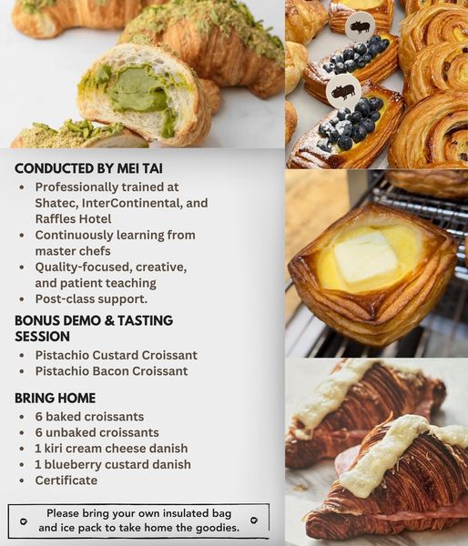 搜索关键词 croissant baking class, pastries Kuala Lumpur, baking workshop Malaysia, hand rolled croissants, baking course, cooking class Damansara Utama, chef Mei Tai, food crafting, French pastry class, bread making lesson优势 Learn to make croissants from scratch,Hands-on experience with dough and lamination,Take home baked and unbaked croissants and danishes,Certificate provided,Demo & tasting session,Taught by a professionally trained chef,Lunch is provided