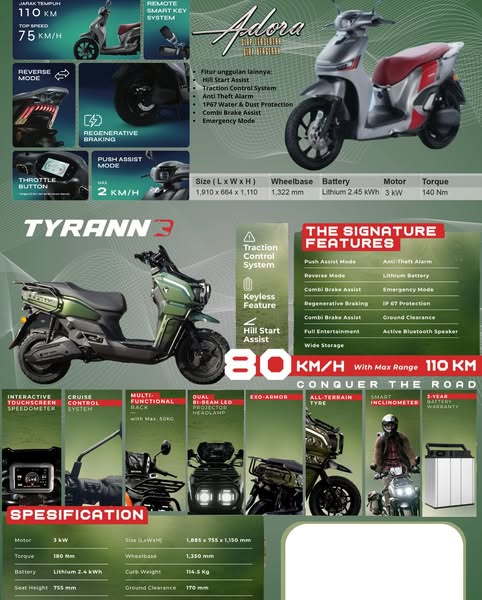 搜索关键词 electric motorcycle, Indomobil Emotor, Adora Tyranno, electric vehicle, zero emission, green transportation, traction control, cruise control, test ride, motorcycle sales优势 Stylish and Futuristic Design (Adora),Tough and Powerful (Tyranno),High Speed (up to 80 KM/H),Long Range (up to 110 KM),Advanced Features (Traction Control, Cruise Control, etc.),0% Interest (Terms & Conditions apply),Test Ride Available
