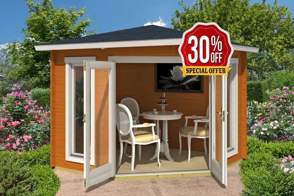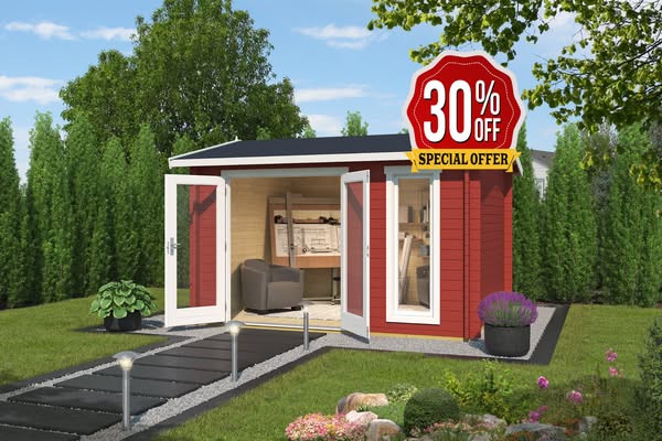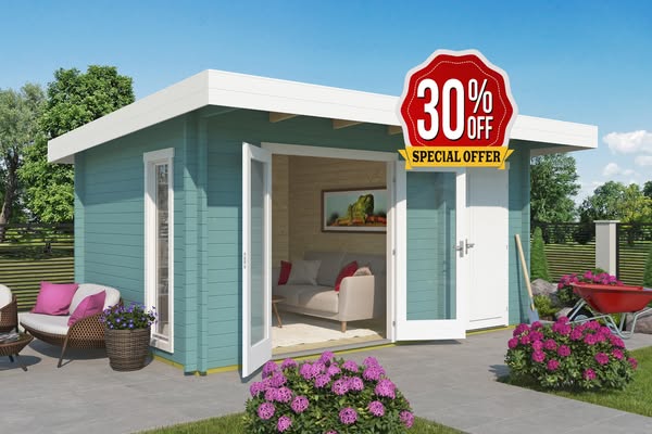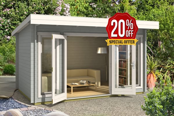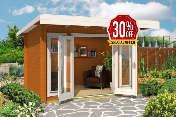Ultra-modern cube-shaped living room or home office cabin with aluminium sliding doors.