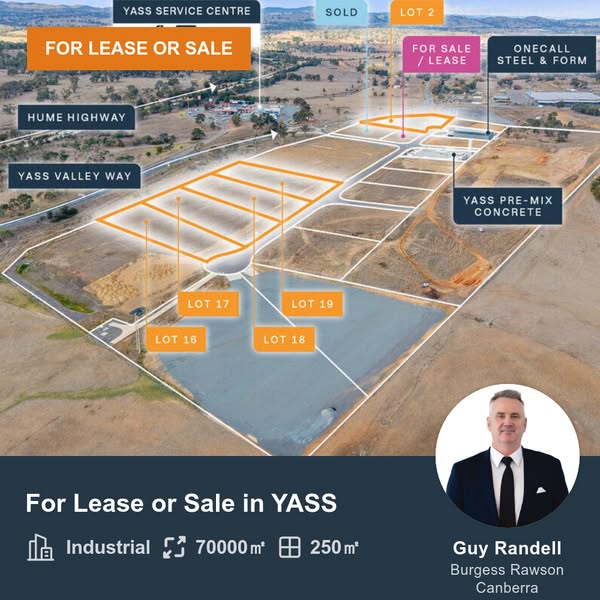 Burgess Rawson is excited to present this high-exposure development site for both sale and lease, offering an impressive 800-meter frontage on Yass Valley Way. With five lots available, ranging from approximately 9,720sqm to 1.6 hectares, this opportunity is part of the expanding Yass Valley Way development. The site is strategically located in an area already hosting prominent operators such as McDonald's, KFC, and Ampol Foodary & Service Station, with more businesses expected to follow. This prime location offers excellent visibility and is ideal for a range of uses, making it a key opportunity for developers, investors, tenants, and owner-occupiers looking to be part of Yass' industrial growth.