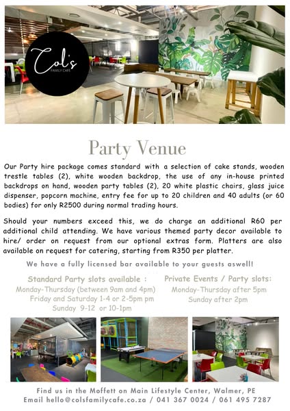 Find us in the Moffett on Main Lifestyle Center in Walmer, PE or call us on 0413670024 / email hello@colsfamilycafe.co.za