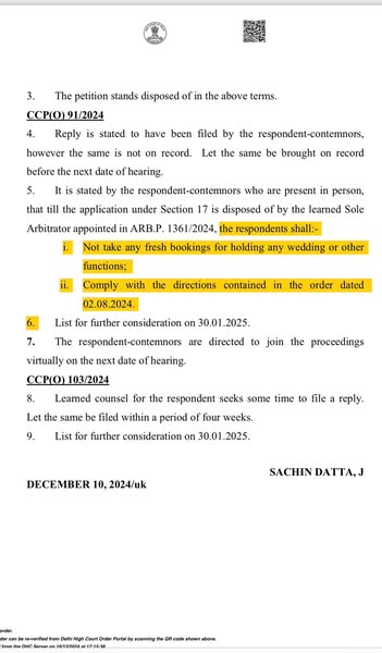 2. Dated 06.12.2024: Confirms and clarifies the 02.08.2024 order and the interpretation of Status quo. Explicitly finding that using the premises for bookings or events violates the court’s directives.