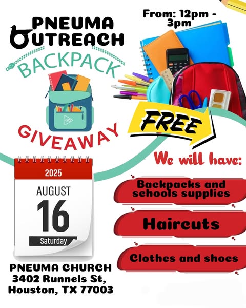 Pneuma outreach will be having a back to school event on 8/16/25 at pneuma church. we will have free back packs, school supplies, cloths,shoes and hair cuts by Olee's Barber Shop