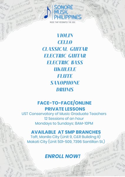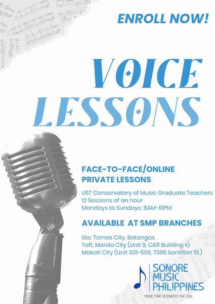 Unleash your inner virtuoso and join the symphony of dreams at Sonore Music Philippines (SMP)! Enroll today at our welcoming studios in Sto. Tomas City, Batangas, Taft, Manila City, or Makati City, and ignite your musical passion! Limited slots available, don't miss your chance to shine. 🎶✨