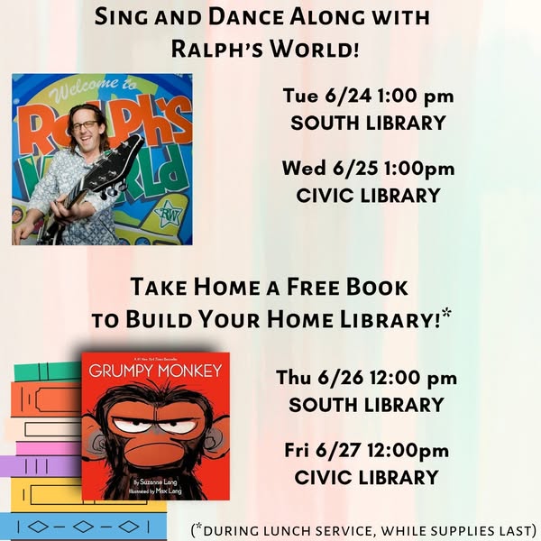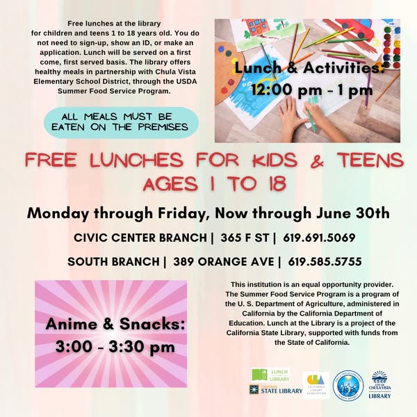搜索关键词 free lunch, library activities, summer fun, kids program, chula vista, public library, civic library, south library, children's lunch, summer activities优势 Free lunch for kids,Fun activities,Accessible at multiple locations