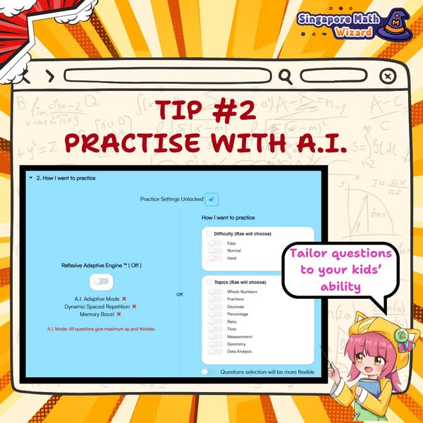 搜索关键词 Singapore Math, online tutoring, math help, exam preparation, adaptive learning, personalized learning, heuristic problems, free trial, student improvement, math skills优势 Fun and engaging learning methods,Adaptive AI learning feature for targeted practice,Personalized and tailored learning plans,Guidance through past year papers,Free trial assessment session