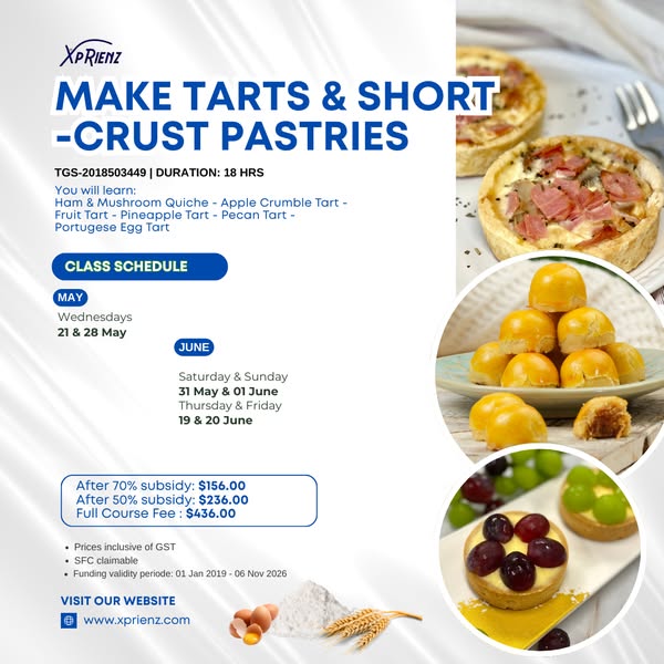 You will learn: Mont Blanc Tart - Tiramisu - Mango Coconut Panna Cotta - Mille Feuille - Crème Brulee - Croissant - Chocolate Tortino - Chocolate Galaxy Cake - Cheesy Mushroom Pie - Danish