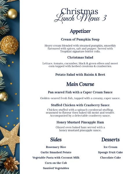 搜索关键词 Tropikist Holiday, Christmas Lunch, Festive Dining, Holiday Celebrations, Team Lunch, Family Christmas, Trinidad Restaurant, Unforgettable Holidays, Christmas Menu, Holiday Season优势 Festive Christmas-inspired menus,Suitable for teams, friends, or family,Creates unforgettable holiday experience