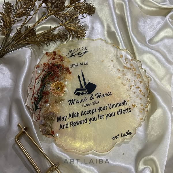搜索关键词 Umrah gift, Mubarak resin, Handcrafted plaque, Religious gift, Islamic art, Epoxy resin gift, Meaningful Islamic, Worldwide delivery, Metallic stand, Custom Islamic优势 Handcrafted,Meaningful gift,Includes metallic stand,Worldwide delivery