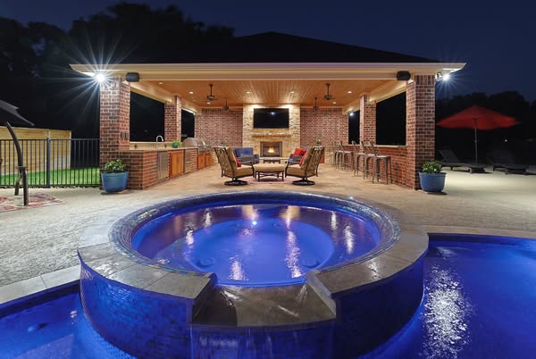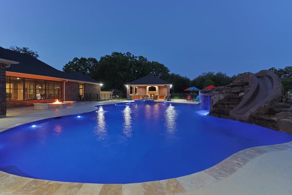 搜索关键词 backyard pool design, custom pool construction, luxury outdoor living, outdoor kitchen design, backyard renovation ideas, home improvement projects, outdoor entertainment space, swimming pool spa, custom pool features优势 Luxurious design,Comprehensive features (spa, slide, grotto),Ample space for entertainment and relaxation,custom-built outdoor kitchen