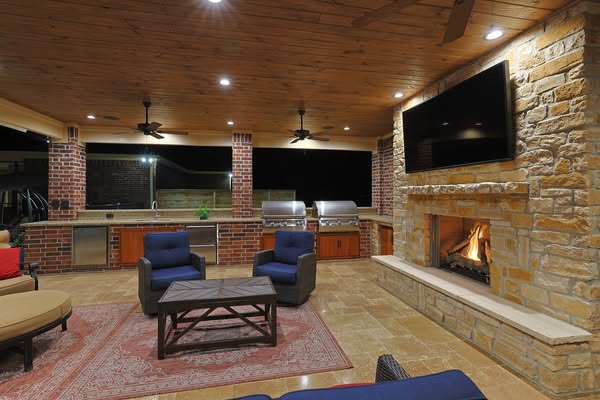 On the opposite side of the kitchen, a 26-foot bar-height counter provides plenty of seating for guests, whether you’re serving drinks or sharing a meal. The focal point of the patio is an eight-foot-wide stone gas fireplace that not only adds warmth but serves as an elegant design element, perfectly complementing the brickwork of the covered patio, which matches the front of the home.