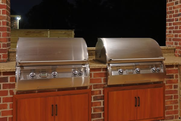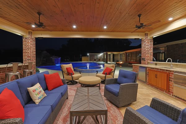 The space around the pool is designed for ultimate comfort and entertainment. Anchoring the backyard is a huge 28’ x 28’ covered patio that provides ample room. The custom-built 26-foot outdoor kitchen is a pit master’s dream, complete with two Fire Magic grills—one for burgers and one for steaks—so you can cook up a feast without missing a beat. Instead of traditional stainless steel, we’ve installed beautifully crafted teak wood doors to add a warm, homey touch that complements the traditional design.