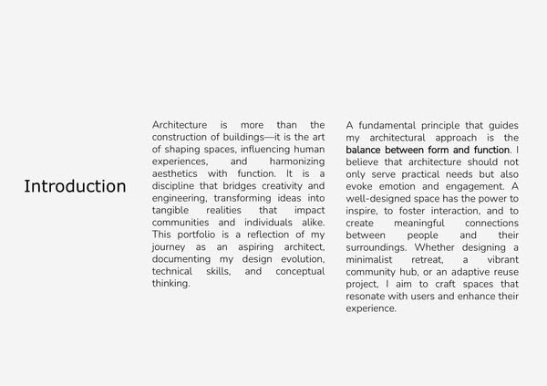 4 years of creativity, passion, and hard work—presenting my architecture portfolio! From concept sketches to final renders, each project is a step in my journey of shaping spaces and bringing ideas to life. Excited to share my vision with you all!