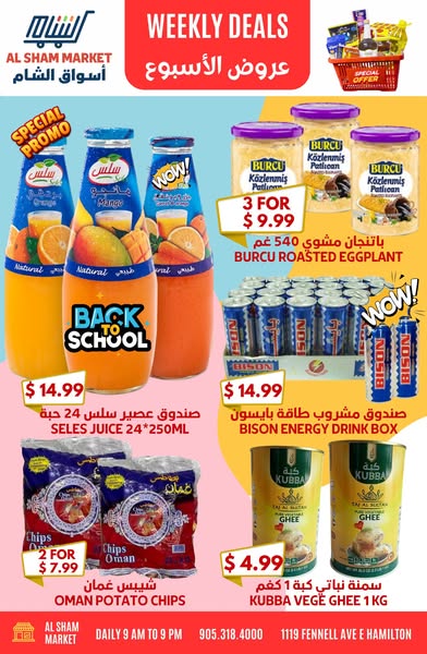 🛒✨ عروض هذا الأسبوع قوية جدا من أسواق الشام ✨🛒 استفيدوا من أسعارنا المميزة على أجود أنواع الخضار، الفواكه والمواد التموينية 🌿🍇🥬 📅 العروض سارية حتى يوم الخميس القادم ⚡️ الكمية محدودة – سارعوا قبل نفاد الكمية! 📍 أسواق الشام – الأفضل دائماً بالجودة والسعر 😍