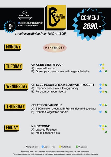 搜索关键词 Central Canteen Budapest, Weekly Menu Budapest, Budapest Lunch Menu, Affordable Lunch Budapest, All You Can Eat Breakfast, Kazinczy Street Food, Lunch Deals Budapest, Fresh Meals Budapest, Budapest Food Promotion, Student Lunch Budapest优势 Fresh meals,New flavors every week,30% off after 2 PM