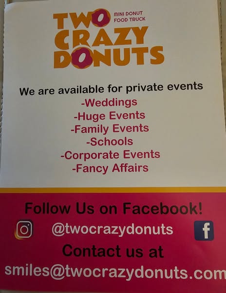 搜索关键词 mini donuts, fresh donuts, variety toppings, new bern north carolina, two crazy donuts, food truck, coffee and donuts, mobile donuts, limited time offer, donuts near me优势 Freshly cooked on site,Wide variety of toppings,Variety of Drinks,Cool TCD swag