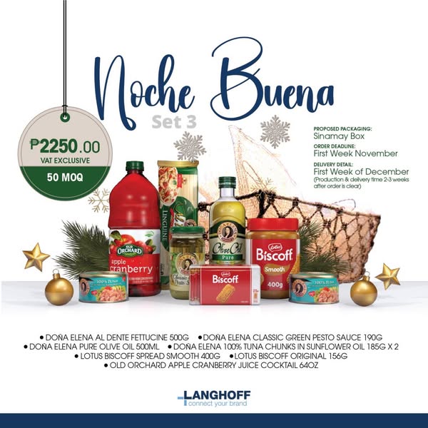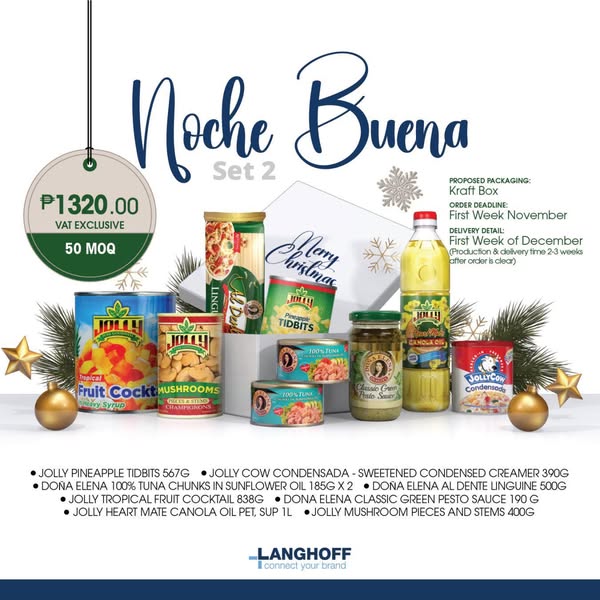 搜索关键词 Christmas Gift, Holiday Gift, Noche Buena Set, Gift Ideas, Corporate Gifts, Festive Food, Christmas Bundles, Langhoff PH, Holiday Season, Gift for Clients优势 Holiday themed,Perfect for gifting,Convenient ready-made set