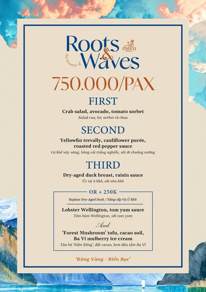 搜索关键词 MOCA Dining, Fine Dining Hanoi, Vietnamese Cuisine, Culinary Experience, Roots and Waves, Nha Tho Street, Upscale Dining, Foodie, Vietnam Restaurant, Regional Ingredients优势 Unique culinary experience showcasing Vietnamese ingredients,High-quality ingredients sourced from different regions,Artistic presentation of dishes,Sophisticated and refined dining atmosphere