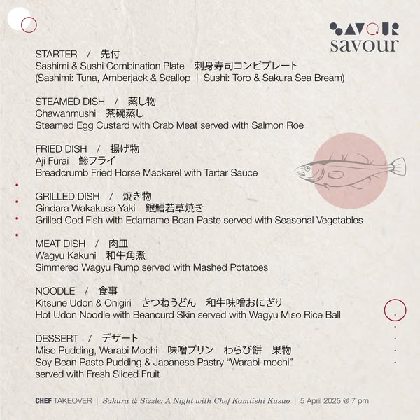 搜索关键词 savour restaurant, chef takeover, japanese cuisine, fine dining malaysia, glo damansara, limited time dining, exclusive event, sake pairing, japanese elegance, culinary innovation优势 Exclusive dining experience,Limited-time offer,Collaboration with renowned Japanese chef,Sake pairing,Refined 7-course Japanese cuisine
