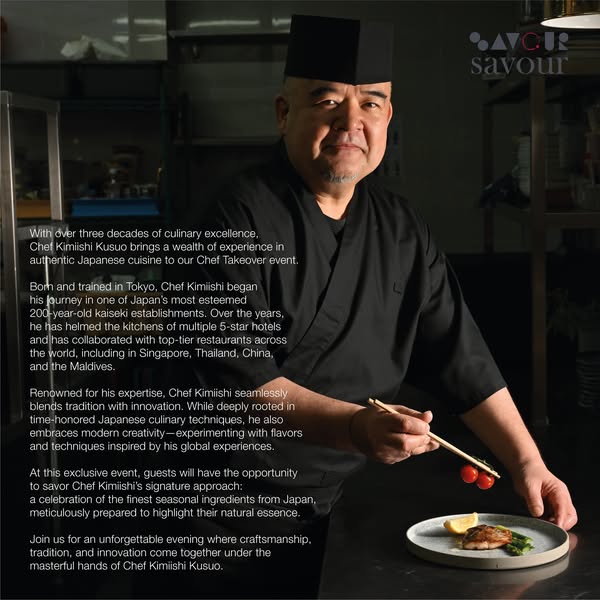 Savour is renowned for its European cuisine with a twist of Asian flavors, and now, for a limited time only, we invite you to an extraordinary 𝐂𝐇𝐄𝐅 𝐓𝐀𝐊𝐄𝐎𝐕𝐄𝐑 featuring acclaimed Chef Kimiishi Kusuo—a master of Japanese cuisine with over 30 years of experience. Witness his refined techniques and artistry as he takes over our kitchen for one exclusive evening.