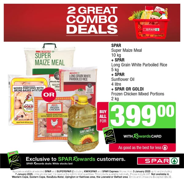 SPAR is here to stretch your budget this January! 💰 Get these must-have combo deals at SELECTED SPAR and SUPERSPAR stores from 3 - 7 January while stocks last! E&OE. Not available in Western Cape, Eastern Cape, KwaZulu-Natal, Upington or Keimoes area, the Lowveld or Belfast area