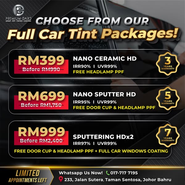 搜索关键词 car tinting Johor Bahru, car tinting JB, UV protection car tint, heat rejection car tint, car window tint优势 High IRR and UVR protection,Durable and long-lasting,Safety features (shatter-resistant),Privacy and clear visibility,Warranty and replacement