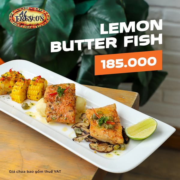 🍋𝐋𝐄𝐌𝐎𝐍 𝐁𝐔𝐓𝐓𝐄𝐑 𝐅𝐈𝐒𝐇: Đánh thức vị giác với món cá áp chảo, hòa quyện cùng nước sốt chanh bơ thanh mát, dùng kèm với bắp, khoai tây nghiền và nấm xào thơm lừng.